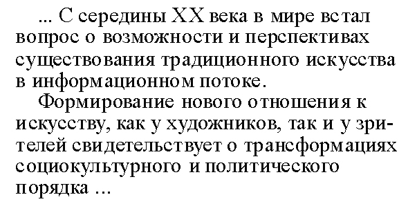 ...In der Mitte XX. Jahrhundertes begann die Welt sich mit der Frage auseinander zu setzen, welche Möglichkeiten und Perspektiven die traditionelle Kunst zum Informationsfluss der modernen Medien und Kommunikation bietet und beitragen kann. Die Formierung der neuen Beziehung zur Kunst Seitens der Künstler wie auch der Zuschauer belegt die soziokulturelle transformation sowie den Wandel der politischen Ordnung …